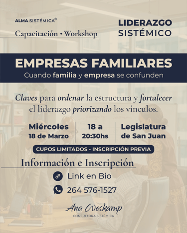 Es por esto que este workshop analiza las dinámicas de las empresas familiares, donde los roles personales y profesionales suelen entrelazarse. Nuestro objetivo es brindar herramientas de alta calidad para preservar el patrimonio y la armonía familiar, evitando pérdidas económicas y potenciando el crecimiento sostenible de la empresa sin sacrificar las relaciones personales.
