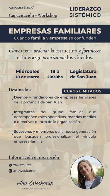 Este workshop tiene la finalidad de informar sobre las dinámicas que ocurren en las empresas familiares donde se mezclan los roles familiares con los empresariales. La finalidad del workshop es brindar información para preservar empresa y familia, enseñando herramientas de alta calidad para evitar pérdidas económicas y hacer prosperar la empresa manteniendo las relaciones personales.